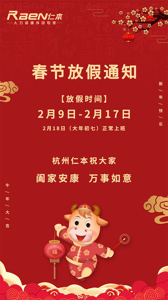 致全體客戶、派遣員工: 春節將至,忙忙碌碌的一年即將過去,馬上就要迎來全新的辛丑牛年!首先向各位仁本的合作伙伴和全體員工致以節日的問候。 杭州仁本春節假期為: 2021年2月9日——2021年2月17日 2月18日(大年初七)正式上班