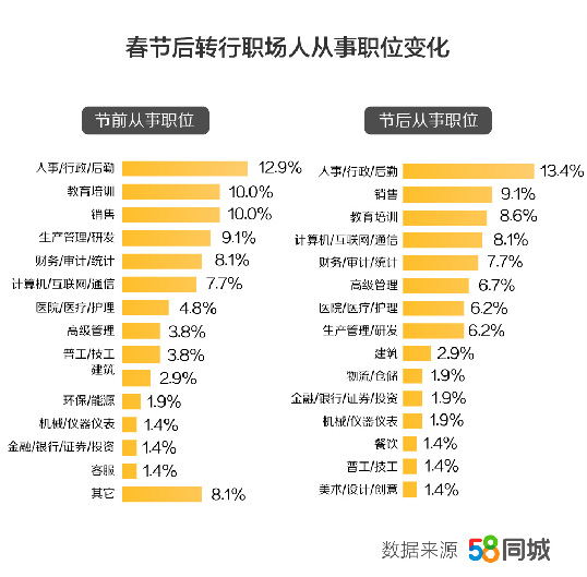 轉(zhuǎn)行偏愛銷售行業(yè),行政是換工作首選職位 據(jù)58同城調(diào)研數(shù)據(jù)顯示,春節(jié)前有轉(zhuǎn)行計(jì)劃的職場人從事的Top3行業(yè)分別是人事/行政/后勤、建筑、教育培訓(xùn),春節(jié)后職場人期望從事的Top3行業(yè)分別是銷售、人事/行政/后勤、金融/銀行/證券/投資。其中,有19.7%的職場人希望在春節(jié)后轉(zhuǎn)行進(jìn)入銷售行業(yè),春節(jié)前從事該行業(yè)的被訪者占比僅為6.6%。由于銷售行業(yè)屬于多勞多得的行業(yè),許多職場人希望通過從事這一行業(yè)來改善收入水平,在春節(jié)后獲得更高的收入。 從具體城市來看,一線城市職場人轉(zhuǎn)行的主要原因是為實(shí)現(xiàn)自我突破,以期得到更好的發(fā)展。一線城市職場人轉(zhuǎn)行更愿意從事銷售和金融等挑戰(zhàn)性大的行業(yè),新一線職場人更偏好選擇人事、銷售、教育等行業(yè)作為新的開始。