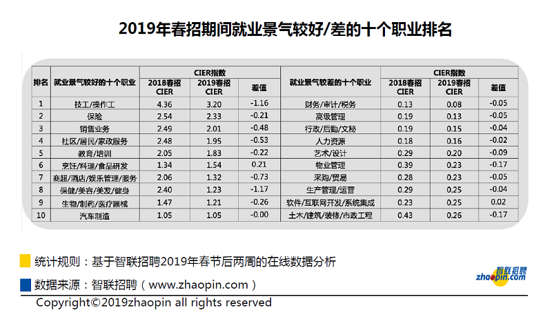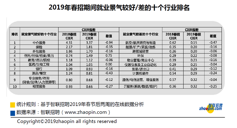 從求職端的數據來看,春招期間找工作的人數同比增加了4%,簡歷投遞次數同比增加18%,這表明單個求職者較去年投遞了更多的簡歷,且求職人數在增加,需求人數在減少的趨勢將整體影響今年春招的就業景氣度。 2019年春招期間就業景氣度低于去年 綜合供需兩端的情況,2019年春招期間的CIER指數降為1.55,較2018年的1.68略有下滑,證明今年春招期間的求職競爭程度更激烈,平均一個求職者對應1.55個用人需求。 二、東部就業形勢墊底,中介服務業的景氣度高居榜首 東部地區春招就業景氣度落后東北,一線城市競爭依然激烈 數據顯示,2019年春招期間CIER指數仍呈現中部、西部、東北以及東部地區依次遞減的趨勢。同比來看,今年的CIER指數較去年均略有下滑,東部地區產業發展比較先進,人才競爭也比較集中,因此春招旺季這一地區的就業壓力也是*大的,景氣度墊底。 從不同城市等級看,2019年春招期間CIER指數仍呈現一線、新一線、二線、三線及四線城市依次遞增的趨勢。其中,僅三、四線城市的CIER指數大于1,表明在這些城市中,企業招聘需求人數要大于求職申請人數;一線、新一線、二線城市的CIER指數小于1,說明企業招聘需求人數要小于求職申請人數。智聯招聘調研顯示,大多數求職者仍然希望在更大的城市就業,因此大城市的競爭也往往會更激烈。 中介服務業的景氣度高居榜首,傳統加工制造業轉型陣痛依然明顯 數據顯示,從2019年春季求職期間排名結果來看,就業形勢最好的行業是中介服務業,CIER指數高達3.37,其次是保險及外包服務,CIER指數分別為1.81、1.70。服務業為代表的第三產業因為服務業的升級和社會轉型的需要,正在持續釋放需求,吸納就業的能力十分強大。值得注意的是,2019年春招期間,在就業形勢較好的前十大行業中,除了信托/擔保/拍賣/典當和醫藥/生物/工程的CIER指數是高于2018年春季求職的,其他的行業的CIER指數都低于去年。 在就業景氣較差的行業中,2019年春招期間航空/航天研究與制造業的就業景氣程度最差,CIER指數僅為0.15,其次是能源/礦產/采掘/冶煉業,為0.20,傳統加工制造業的就業形勢仍然堪憂,在去年備受關注的貿易/進出口行業,在春招旺季景氣度同比下行。