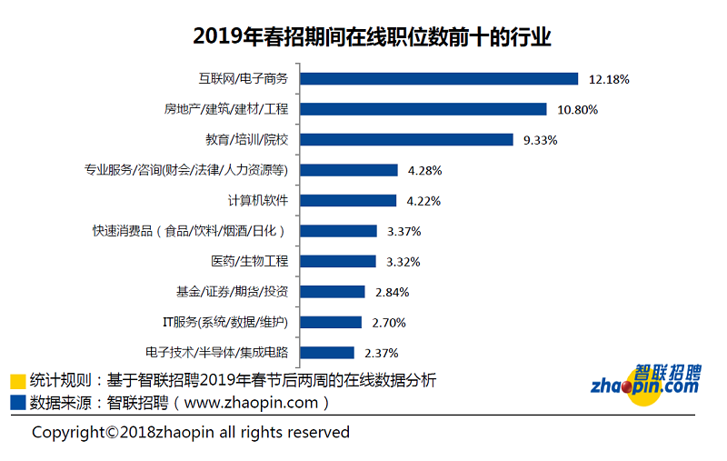 大企業薪酬誘人,小微企業工資低于平均線 數據顯示,2019年春招期間,企業規模越大,平均薪酬越高。在10,000人以上的巨無霸企業工作的員工,平均薪酬最高,為9,329元,其次是1,000-9,999人的大公司,平均薪酬為9,053元,平均薪酬最低的是小微企業的員工,為7,601元。企業規模越大,意味著具有成熟的盈利能力和完善的薪酬福利體系,員工的利益能夠得到*大程度的保障,因此平均薪酬越高。 外商薪酬最高,民營企業的平均薪酬最低 數據顯示,2019年春招期間,外企的平均薪酬最高,為9,070元,其次是上市公司,平均薪酬為8,913元,薪酬最低的是民營企業,平均薪酬僅為8,025元。 四、互聯網、房地產行業人才彈藥充足,教育、醫藥工程等新興熱門行業招工難 互聯網/電子商務行業用工需求*大 智聯招聘數據顯示,從春季需求量*大的十大行業來看,互聯網/電子商務、房地產/建筑/建材/工程、教育/培訓/院校行業成為前三甲。這個排名和2018年的保持一致,盡管互聯網行業經過了2018年招聘需求全線下降的經歷,仍然是穩坐吸納就業的寶座的“頭號玩家”。值得注意的是,電子技術/半導體/集成電路進入了需求前十的行業,這和國家去年開始大力支持中國發展自己的芯片有關,政策的傾斜會讓電子技術/半導體/集成電路行業的市場更加廣闊,因此企業的用人需求也隨之大增。既然有新的行業上榜,也就代表有其他的行業熱度在下降,貿易/進出口行業在2018年在企業發布的在線職位數中排名第八,今年的排名下滑到第11名,或受到中美貿易摩擦對發展信心的影響所致。