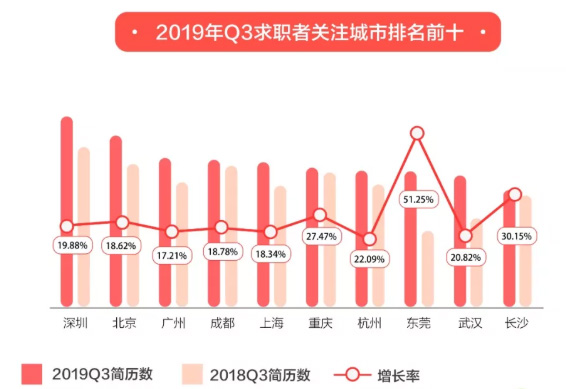 成都則陸續(xù)出臺《引進(jìn)培育交子金融人才實(shí)施辦法》《重點(diǎn)項(xiàng)目人才開發(fā)指引(2019)》等政策,吸引高學(xué)歷、高技能人才赴蓉共謀發(fā)展,城市的現(xiàn)代化、國際化水平日益提升,也促進(jìn)企業(yè)招聘更加活躍。 58同城招聘研究院《2019三季度人才流動報(bào)告》還反映出,鄭州企業(yè)招聘活躍度同比增幅最大,繼二季度以來繼續(xù)保持第一的位次。作為中原城市群中心的鄭州,位居“新一線城市”榜全國第9名,“中國大陸最佳商業(yè)城市”第12名,持續(xù)提升的城市綜合實(shí)力讓更多企業(yè)聚集于此,招聘熱度不斷提高。 《2019三季度人才流動報(bào)告》對部分城市求職情況進(jìn)行了分析。其中,深圳是求職者最關(guān)注的城市,其次是北京、廣州、成都和上海。深圳作為改革開放的高地和粵港澳大灣區(qū)的建設(shè)重鎮(zhèn),產(chǎn)業(yè)發(fā)達(dá)、收入可觀,成為求職者就業(yè)的“天堂”。 而成都在求職關(guān)注度上超過上海,與其大力度的人才政策不可分割,2017年7月,成都出臺《實(shí)施人才優(yōu)先發(fā)展戰(zhàn)略行動計(jì)劃》,2年來吸引28.6萬本科及以上人才落戶,充實(shí)了成都的“求職大軍”。 在求職者關(guān)注度增幅上,東莞以51.25%的增長值一騎絕塵,其次是長沙、杭州和武漢。由于東莞位于粵港澳大灣區(qū),收入水平高、發(fā)展?jié)摿Υ?,但生活成本低于深圳、廣州等城市,受到了眾多求職者的青睞。近年來,長沙出臺“人才政策22條”,杭州發(fā)布《關(guān)于加快推進(jìn)杭州人才國際化的實(shí)施意見》,武漢發(fā)起“四大資智聚漢工程”,吸引精英人才共促區(qū)域發(fā)展,進(jìn)一步提高了當(dāng)?shù)氐那舐殶岫取?/span>