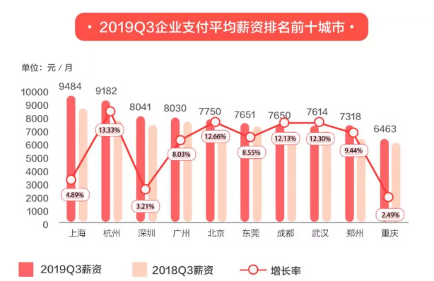 上海企業(yè)平均支付月薪達(dá)9484元,杭州薪資同比增幅最高 58同城招聘研究院《2019三季度人才流動報(bào)告》顯示,2019年三季度,企業(yè)支付薪資均有一定程度的上漲。其中,上海企業(yè)平均支付月薪達(dá)9,484元,排名第一,其次是杭州、深圳和廣州。上海是全國傳統(tǒng)的經(jīng)濟(jì)中心,人均GDP突破2萬美元,優(yōu)秀人才為上海企業(yè)創(chuàng)造了巨大的財(cái)富,而企業(yè)也將這些價(jià)值以高薪形式返還給人才。