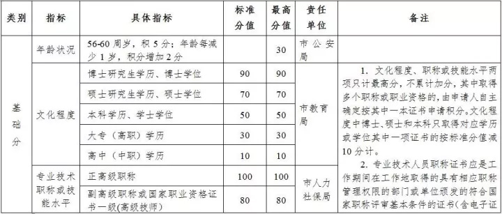 基礎(chǔ)分指標(biāo)包含年齡狀況、文化程度、專業(yè)技術(shù)職能或技能水平、就業(yè)及參加社保情況、住所及居住年限情況等指標(biāo)。