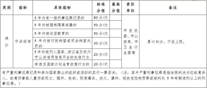 同時(shí),對(duì)一般刑事犯罪、強(qiáng)制隔離戒毒的、收容教育、行政拘留或司法拘留處罰的及失信行為、違反國(guó)家計(jì)劃生育政策行為等設(shè)置了扣分項(xiàng),并有5年的追溯期限,最多的一次可扣80分,并實(shí)行累計(jì)扣分,不設(shè)上限。
