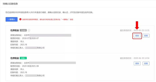 注意:如有“已失效”狀態的信息,則需先刪除之后才能點擊“一鍵確認”。